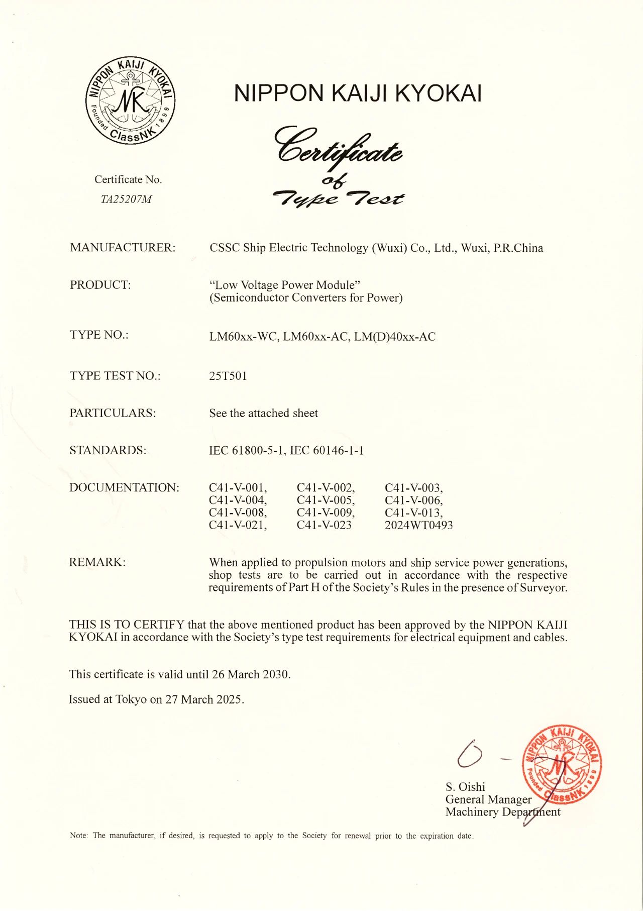 2025年3月27日,中船賽思億(無(wú)錫)電氣科技有限公司(CSSC Ship Electric Technology ( Wuxi) Co.,Ltd.)核心變頻電控設(shè)備順利取得日本船級(jí)社(NK)型式認(rèn)可證書,成為國(guó)內(nèi)為數(shù)不多的取得日本船級(jí)社(NK)型式認(rèn)可證書的船舶電力推進(jìn)企業(yè)。目前中船賽思億已取得CCS、BV、RINA、DNV、LR、ABS、NK等七大國(guó)際主流船級(jí)社型式認(rèn)可證書,是目前國(guó)內(nèi)唯一一家擁有七大船級(jí)社型式認(rèn)可證書的國(guó)產(chǎn)船舶電力推進(jìn)企業(yè),對(duì)中船賽思億的海內(nèi)外市場(chǎng)開(kāi)拓和國(guó)際化發(fā)展進(jìn)程,具有重要意義。